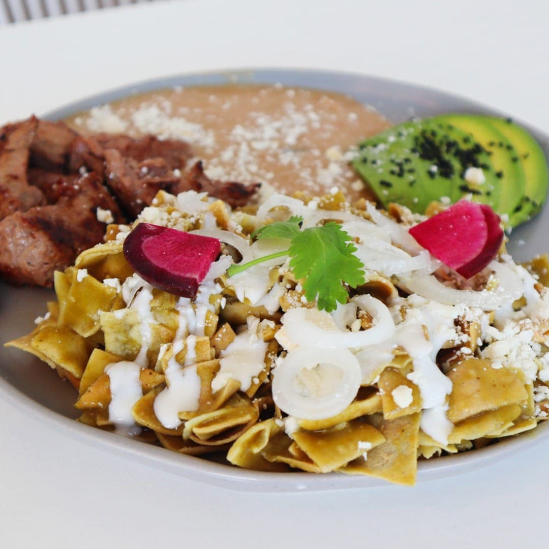 Con crema y queso veganos, acompañados de frijoles y aguacate