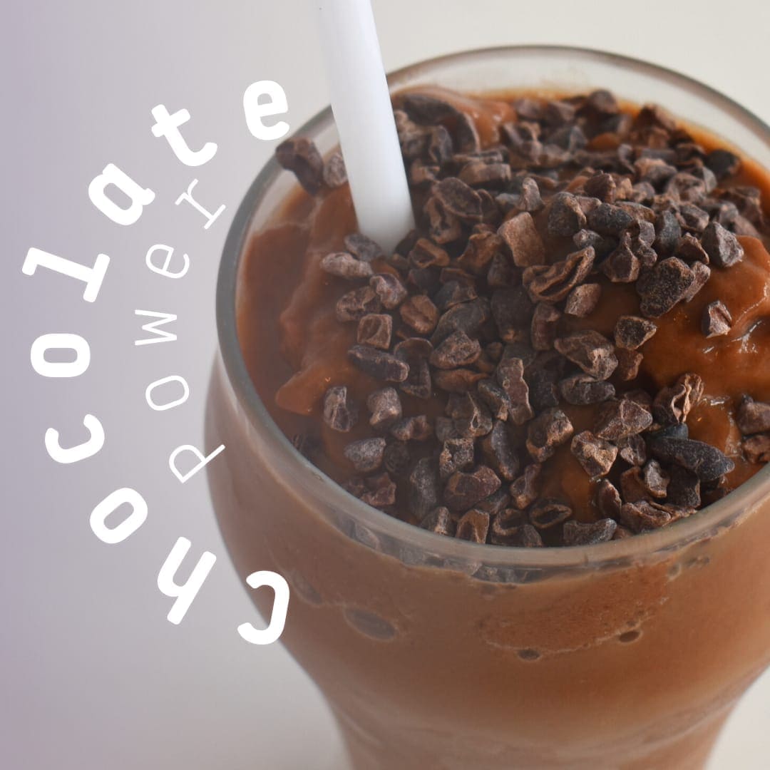 Leche de almendras, cacao, crema de almendra, dátil, maca, canela. Topping: cacao nibs