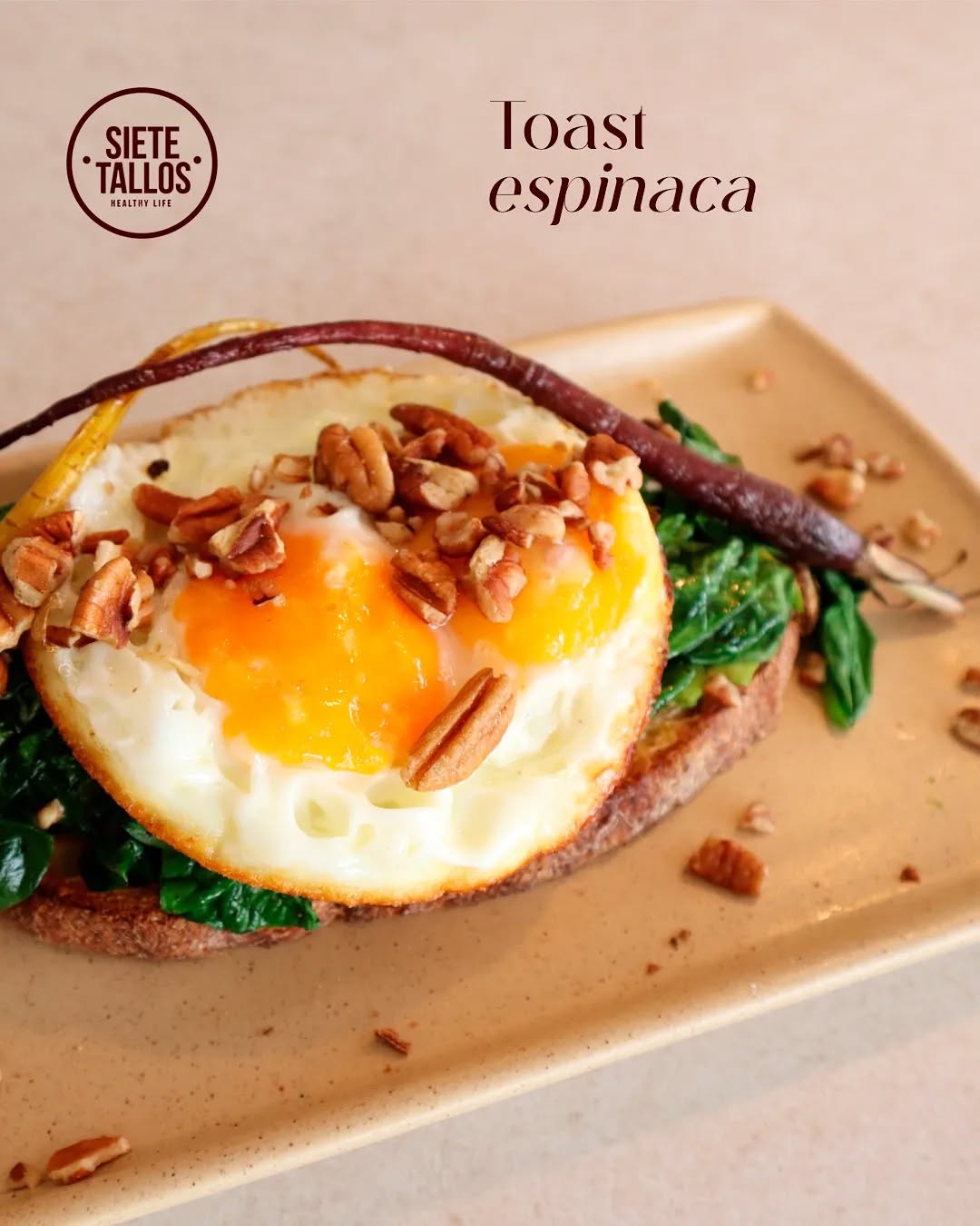 Pan masa madre, aguacate laminado, espinacas salteadas, 2 huevos estrellados y nuez