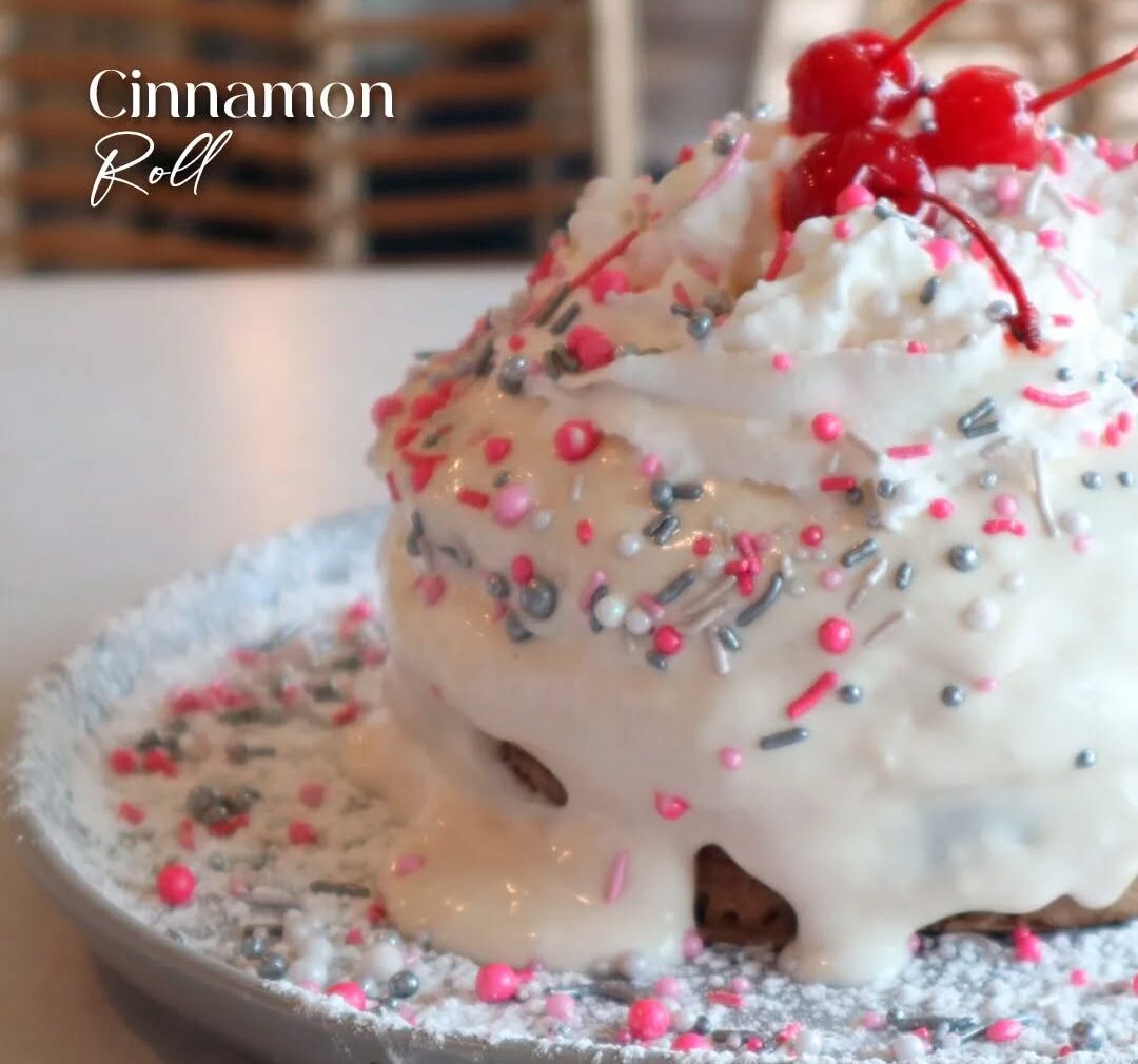 Pancake mezcla de casera con canela, bañado con un glaseado de Philadelphia, coronado con crema chantilly grajeas de colores