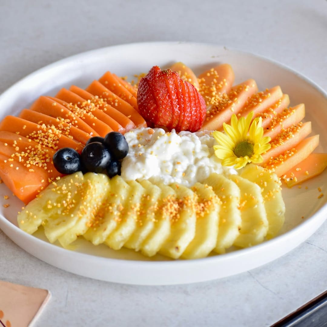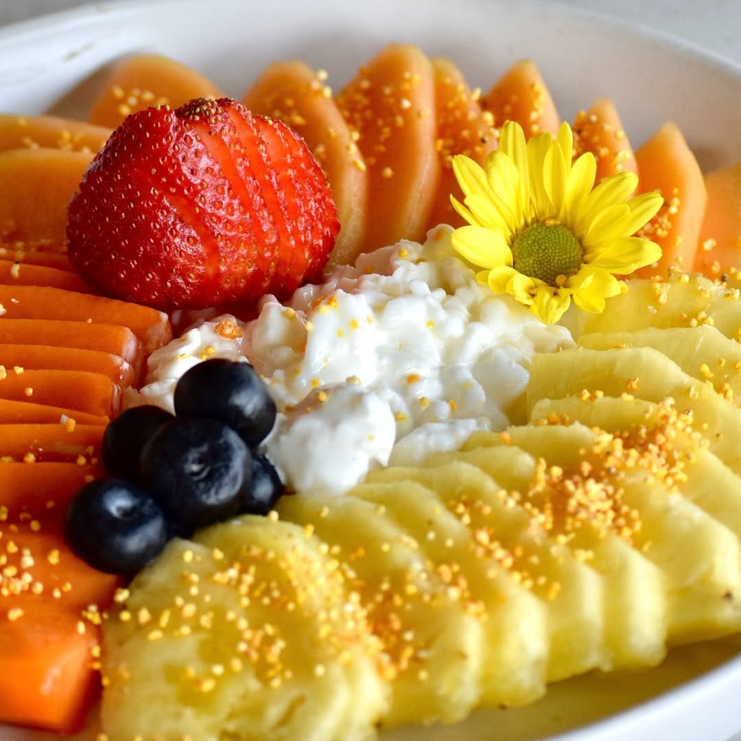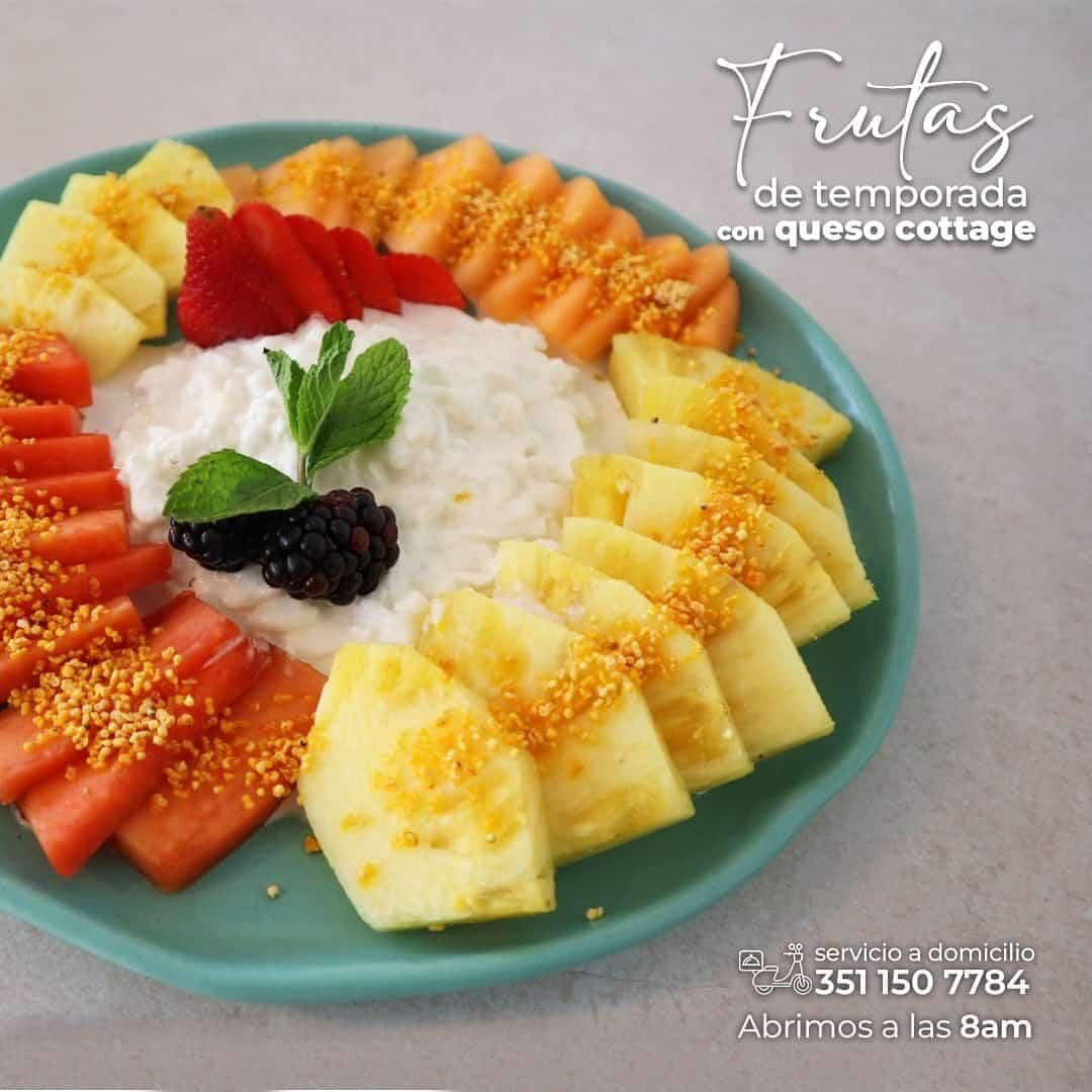Queso Cottage, papaya, melón, plátano y fresa, acompañado de miel de abeja y granola