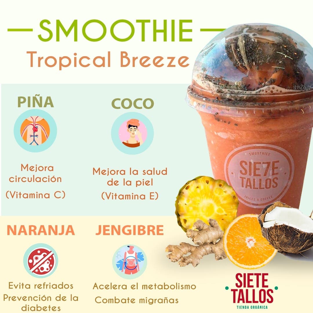 Agua de coco o leche de coco, piña, fresa, naranja, plátano, jengibre, cúrcuma, gojis, stevia