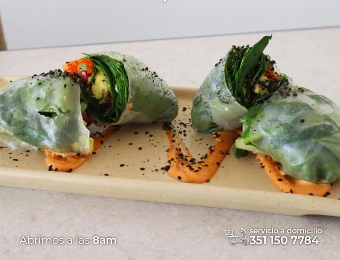 Rollo hoja de arroz con vegetales blanqueados, aguacate y aderezo chipotle